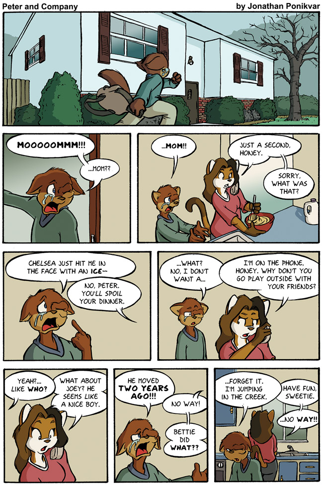 Reason number two why Peter is about to meet Seth: his parents are completely ignorant to his issues. This is also (mostly) true to life, as while my mom did help me when I was injured, she also was completely oblivious to my bullying and honestly believed I was a popular kid. She didn’t find out the truth until I started writing this comic years later, and was heartbroken when she read the stories of what I went through.