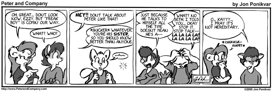 This strip introduces two more main characters: Ezzy, Peter's sister, and Chelsea the bear, a socially-popular girl who lives across the street from them and is Peter's primary bully.