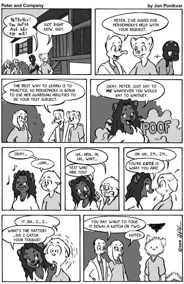 Persephoni has always had the ability to transform into an ordinary bunny rabbit to keep close to Chelsea, but up until now that has been the extent of her "morphing" abilities. Finally the question is answered as to whether or not she can turn into anything else at whim. The Elite Guardians are indeed able to change their appearance to whatever they need for a given situation. This gives them the ability to adapt quickly to keep their child out of danger, all while keeping said child in the dark as to the existence of the Guardians.