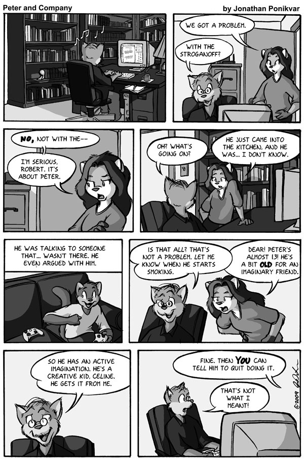 Ladies and gentlemen, Peter’s parents: Robert and Celine. Until this page they had no official names, or even a significant amount of dialogue (particularly on Robert’s part. I think he had two individual spoken lines total before this page). I’ve really meant to bring them more into the spotlight, since really they should have as much of an impact on Peter’s life as Seth does... or perhaps that’s part of the reason Peter has Seth in the first place.