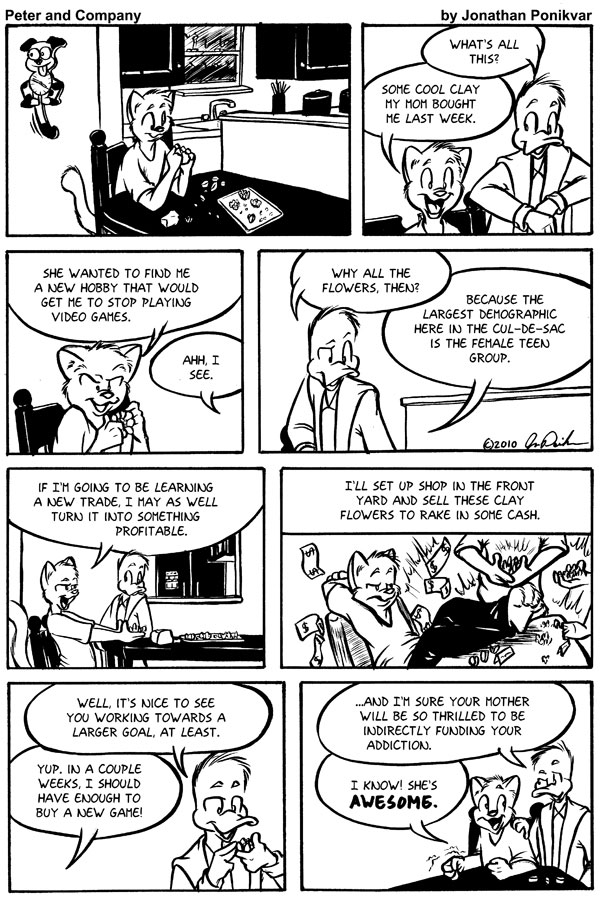 I’d like to mention that everything that happens in this story arc is entirely true. When I was 11 years old, I really did come up with the idea to sell clay flowers to make some quick cash off my unsuspecting neighbors. The results of this venture will be revealed as the pages progress, but this is one of the perfect examples of my youthful eccentricity; I really don’t have to embellish this story at all to make it more interesting or funny. It’s simply crazy enough on its own.