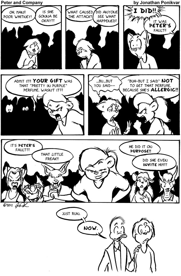This was the final page of Whitney’s party to feature character cameos from other artists! A HUGE thanks goes out to everyone who offered their creations to appear as guests at Whitney’s party over the past few pages. Shout-outs for this page (standing behind Chelsea in the angry mob) include: