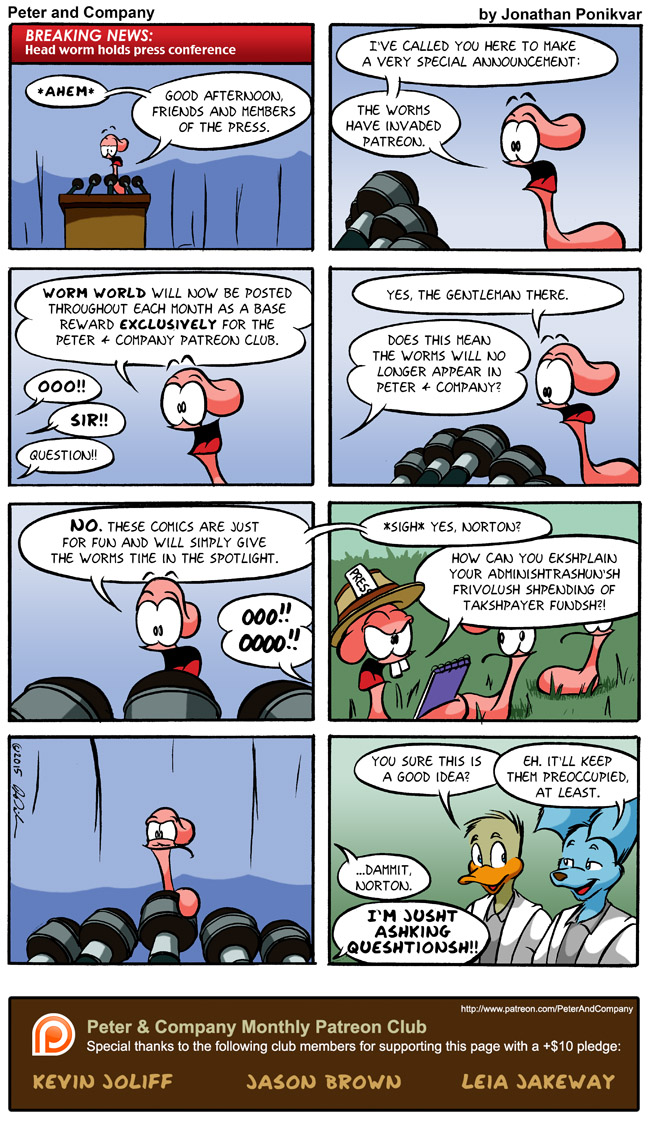The Peter & Company Patreon campaign has been completely revamped. The only individual reward tier is a simple $10/month pledge, and in addition to a wealth of behind-the-scenes content and early access to each page, Monthly Club members also will exclusively receive several pages of Worm World each month!